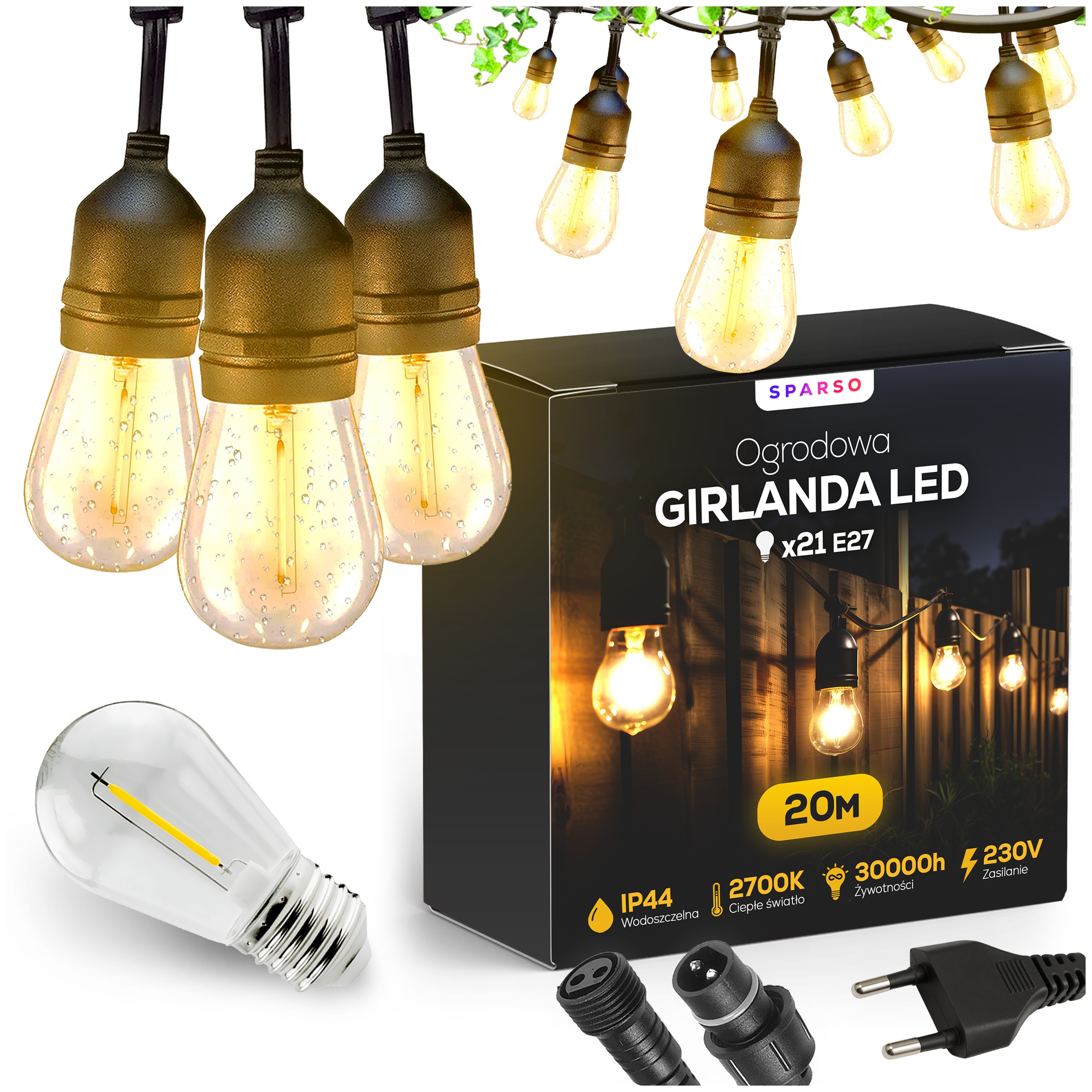 20 metrów długości i aż 21 gniazd E27 LED to bardzo praktyczne rozwiązanie do oświetlenia ogrodu.