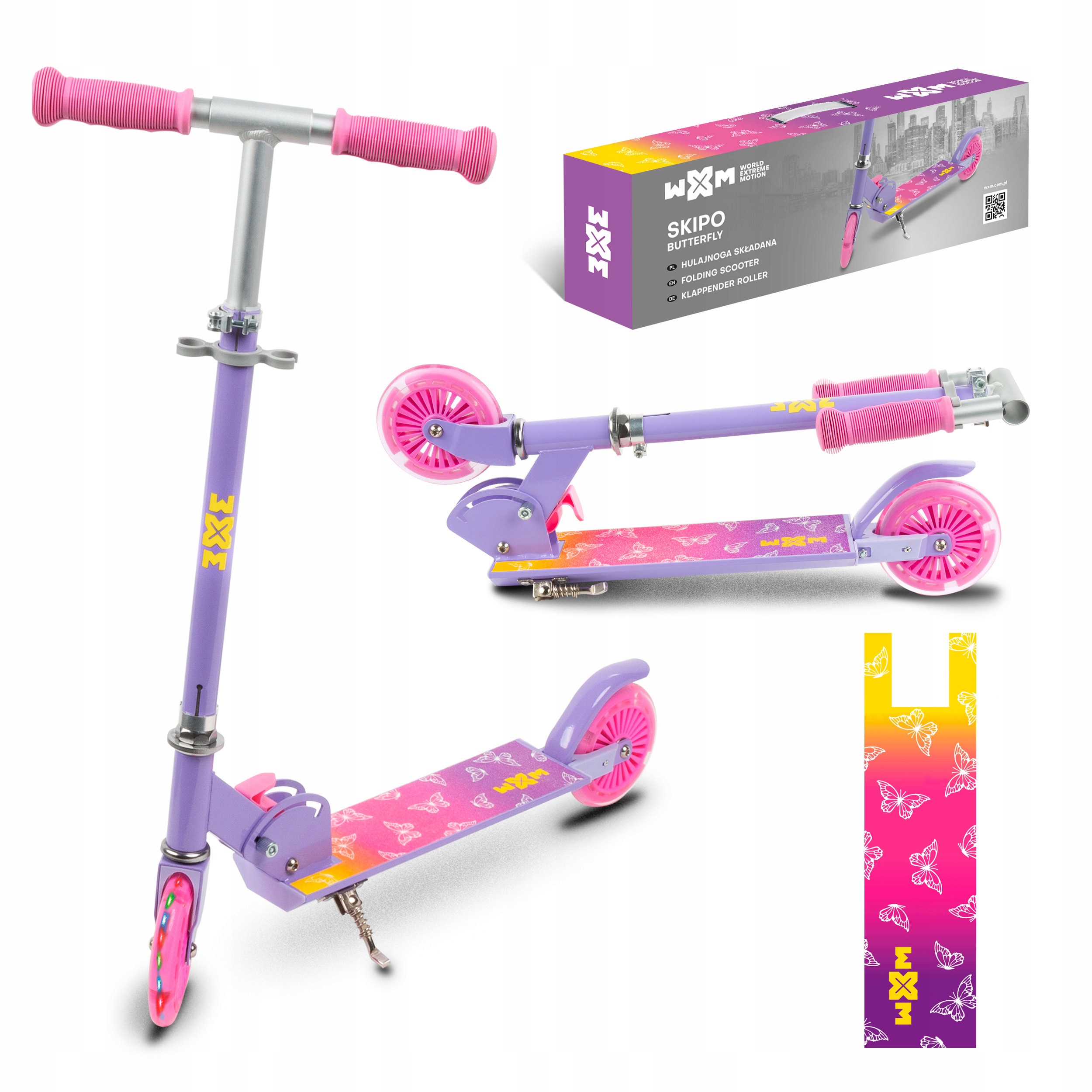 Hej, Mirki i Mirabelki! Zauważyłem na Allegro super okazję na hulajnogę dla dzieci – Kidwell Wxm Skipo Butterfly 3+. Sama w sobie jest już fajna, ma te ledowe koła 120 mm, co wygląda mega, i jest składana, więc zajmuje mało miejsca. To idealne rozwiązanie na spacery i zabawę na świeżym powietrzu.