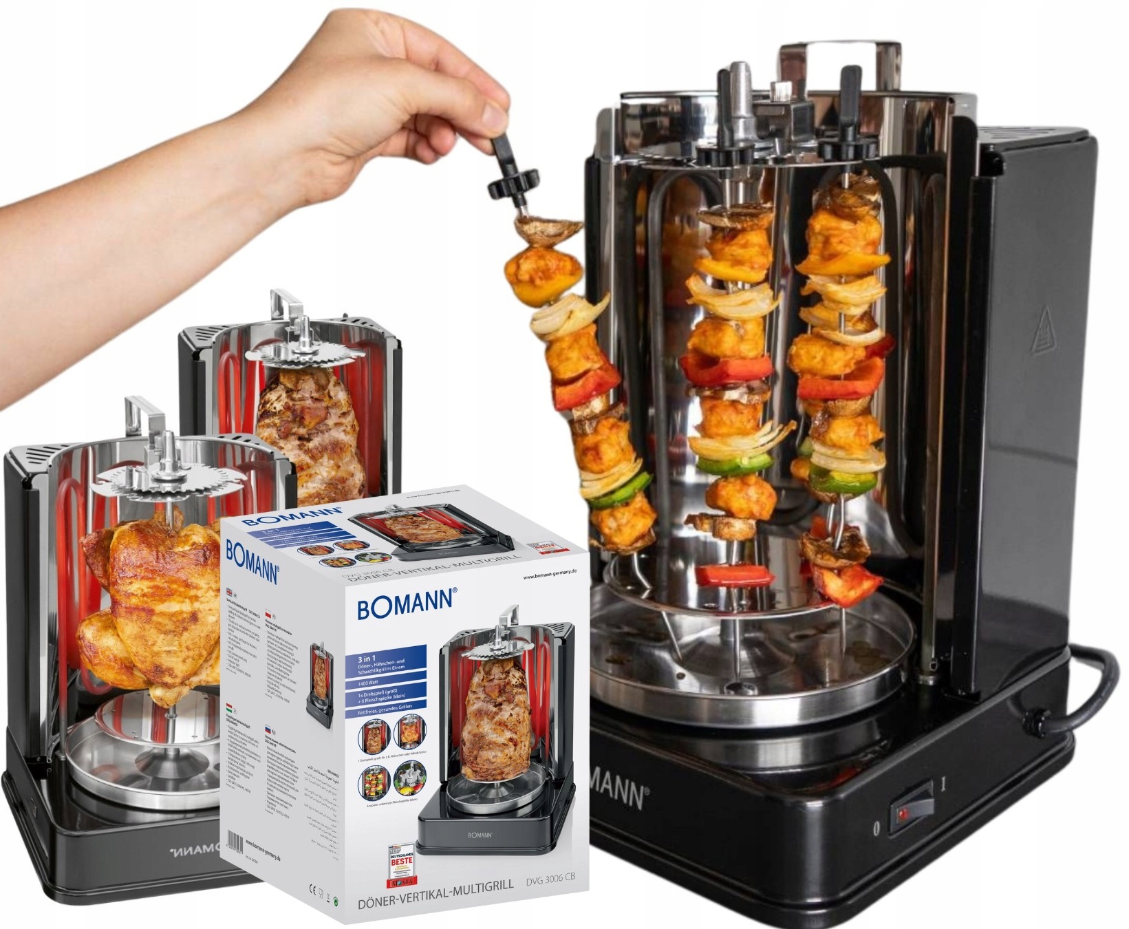Szukasz sposobu na szybkie i smaczne przygotowanie dań z grilla lub kebabów? Elektryczny multigrill Bomann DVG 3006 to doskonałe rozwiązanie dla miłośników domowej kuchni. Ten pionowy grill o mocy [moc - nie podana w opisie, można dodać "dużej mocy" lub usunąć zdanie], wyróżnia się prostotą obsługi i kompaktową konstrukcją, idealną nawet do mniejszych kuchni. Urządzenie pozwala na przygotowanie soczystych kebabów, a także innych potraw grillowanych.