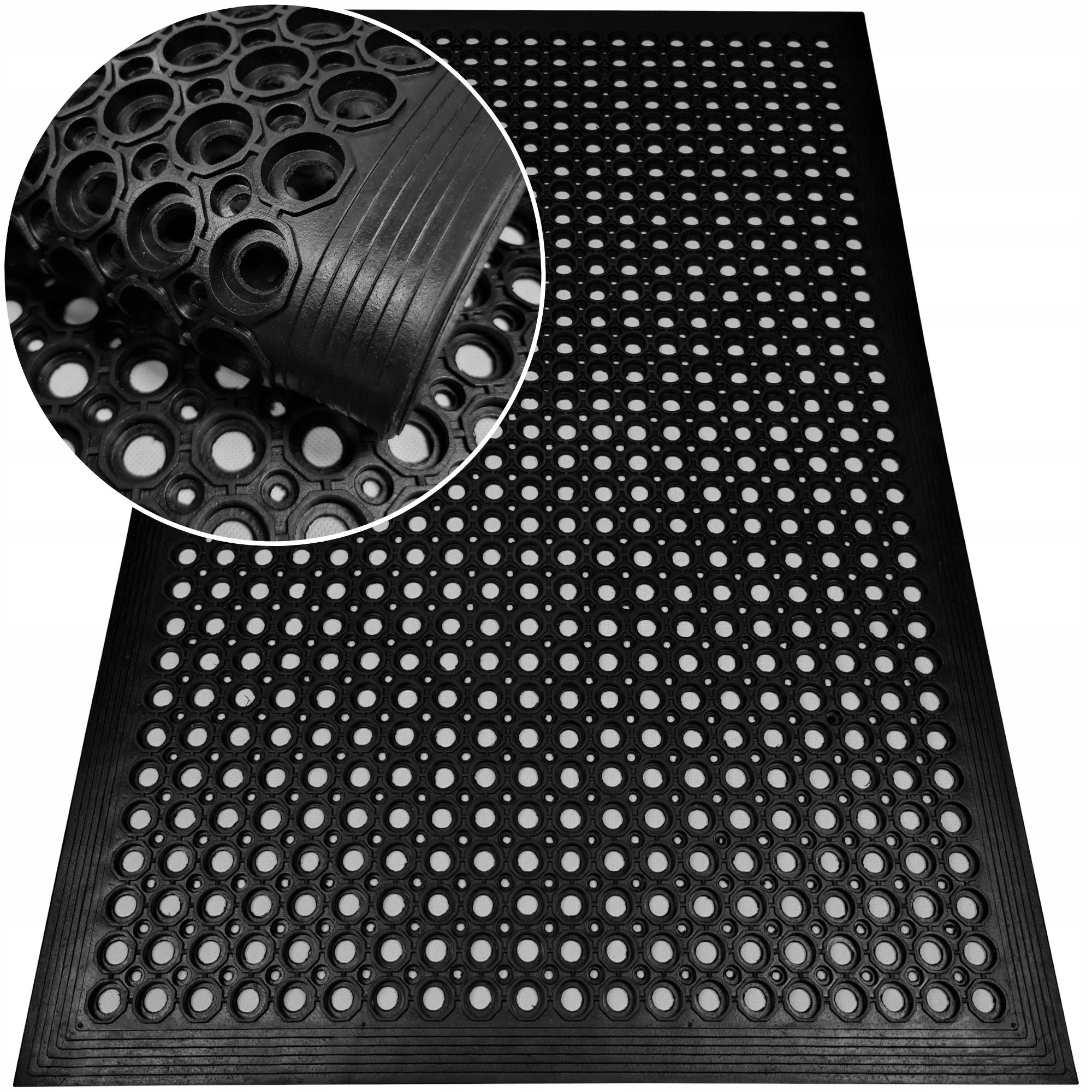 Solidna i praktyczna wycieraczka gumowa, idealna do ochrony domu przed brudem i wilgocią. Ten model o wymiarach 60x90 cm, wykonany z wytrzymałej gumy, posiada ażurowy wzór i specjalny najazd pod drzwi, co zapewnia skuteczne czyszczenie butów i zapobiega wpadaniu brudu do wnętrza. To doskonała ochrona dla Twoich podłóg, szczególnie w okresie jesienno-zimowym.